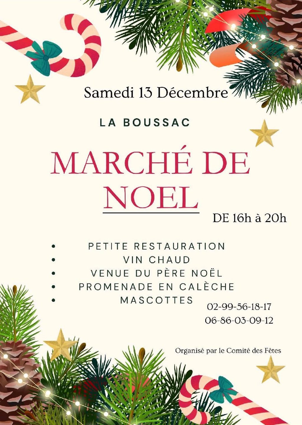 Le marché de Noël organisé par le comité des Fêtes de La Boussac aura lieu le samedi 13 décembre 2025 de 16h à 20h rue du Mont Saint Michel devant la mairie.